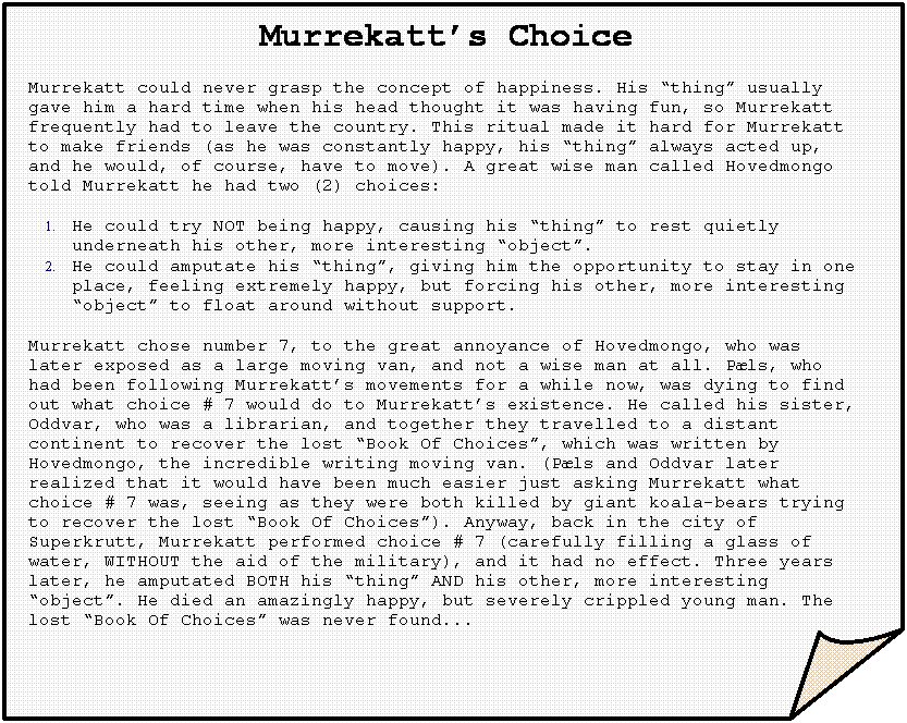 Murrekatt’s Choice Murrekatt could never grasp the concept of happiness. His “thing” usually gave him a hard time when his head thought it was having fun, so Murrekatt frequently had to leave the country. This ritual made it hard for Murrekatt to make friends (as he was constantly happy, his “thing” always acted up, and he would, of course, have to move). A great wise man called Hovedmongo told Murrekatt he had two (2) choices: