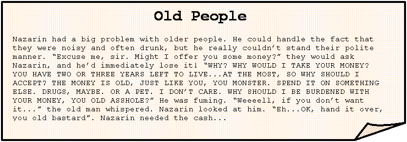 Old People Nazarin had a big problem with older people. He could handle the fact that they were noisy and often drunk, but he really couldn’t stand their polite manner. “Excuse me, sir. Might I offer you some money?” they would ask Nazarin, and he’d immediately lose it! “WHY? WHY WOULD I TAKE YOUR MONEY? YOU HAVE TWO OR THREE YEARS LEFT TO LIVE...AT THE MOST, SO WHY SHOULD I ACCEPT? THE MONEY IS OLD, JUST LIKE YOU, YOU MONSTER. SPEND IT ON SOMETHING ELSE. DRUGS, MAYBE. OR A PET. I DON’T CARE. WHY SHOULD I BE BURDENED WITH YOUR MONEY, YOU OLD ASSHOLE?” He was fuming. “Weeeell, if you don’t want it...” the old man whispered. Nazarin looked at him. “Eh...OK, hand it over, you old bastard”. Nazarin needed the cash... |