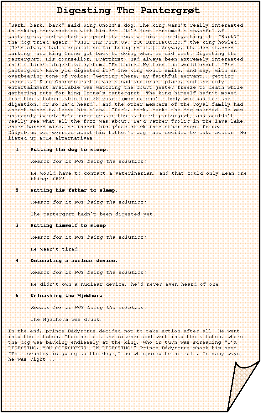 Digesting The Pantergrøt ”Bark, bark, bark” said King Ononø’s dog. The king wasn’t really interested in making conversation with his dog. He’d just consumed a spoonful of pantergrøt, and wished to spend the rest of his life digesting it. “Bark?” the dog tried again. “SHUT THE FUCK UP, YOU BITCHFUCKER!” the king howled. (He’d always had a reputation for being polite). Anyway, the dog stopped barking, and king Ononø got back to doing what he did best: Digesting the pantergrøt. His counsellor, Bråtthæst, had always been extremely interested in his lord’s digestive system. “Ho there! My lord” he would shout. “The pantergrøt? Have you digested it?” The king would smile, and say, with an overbearing tone of voice: “Getting there, my faithful servant...getting there...” King Ononø’s castle was a sad and cruel place, and the only entertainment available was watching the court jester freeze to death while gathering nuts for king Ononø’s pantergrøt. The king himself hadn’t moved from the kitchen table for 28 years (moving one’ s body was bad for the digestion, or so he’d heard), and the other members of the royal family had enough sense to leave him alone. “Bark, bark, bark” the dog sounded. He was extremely bored. He’d never gotten the taste of pantergrøt, and couldn’t really see what all the fuzz was about. He’d rather frolic in the lava-lake, chase barbed wire, or insert his jånep-stick into other dogs. Prince Dådyrbrus was worried about his father’s dog, and decided to take action. He listed up some alternatives: 1. Putting the dog to sleep. Reason for it NOT being the solution: He would have to contact a veterinarian, and that could only mean one thing: SEX! 2. Putting his father to sleep. Reason for it NOT being the solution: The pantergrøt hadn’t been digested yet. 3. Putting himself to sleep Reason for it NOT being the solution: He wasn’t tired. 4. Detonating a nuclear device. Reason for it NOT being the solution: He didn’t own a nuclear device, he’d never even heard of one. 5. Unleashing the Mjødhora. Reason for it NOT being the solution: The Mjødhora was drunk. In the end, prince Dådyrbrus decided not to take action after all. He went into the citchen. Then he left the citchen and went into the kitchen, where the dog was barking endlessly at the king, who in turn was screaming “I’M DIGESTING, YOU COCKSUCKER! IM DIGESTING!” Prince Dådyrbrus shook his head. “This country is going to the dogs,” he whispered to himself. In many ways, he was right... |