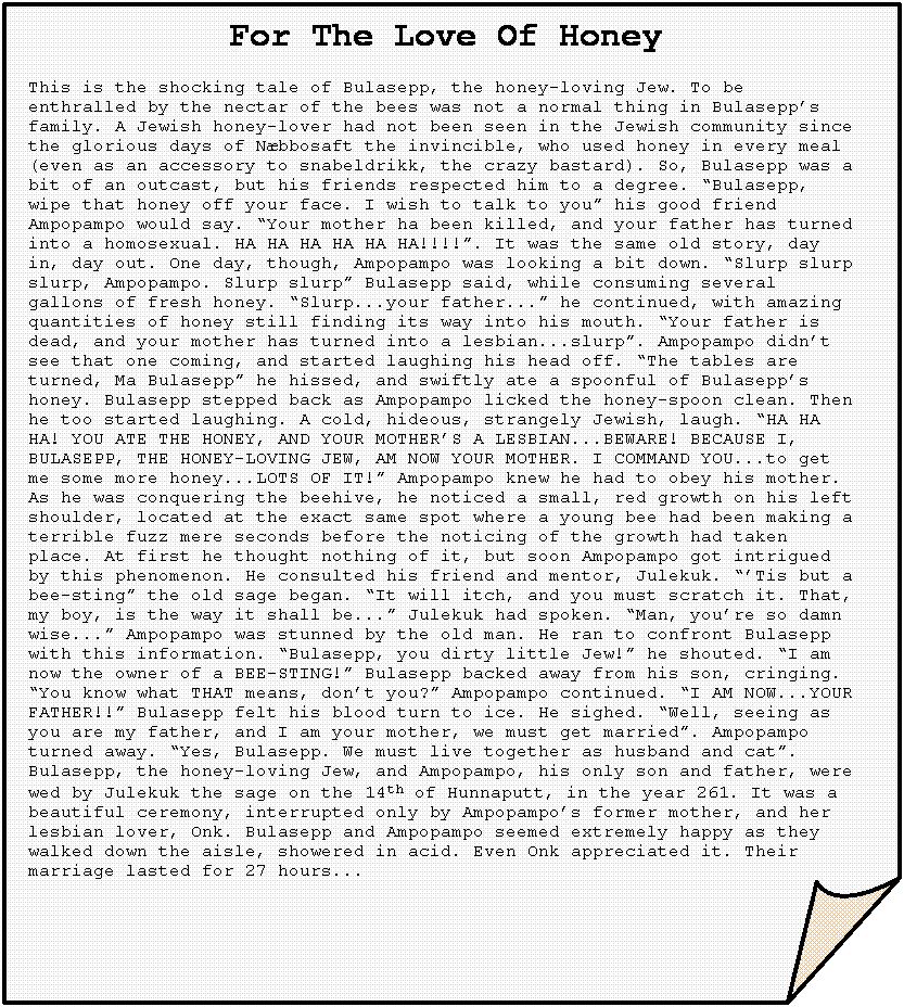 For The Love Of Honey This is the shocking tale of Bulasepp, the honey-loving Jew. To be enthralled by the nectar of the bees was not a normal thing in Bulasepp’s family. A Jewish honey-lover had not been seen in the Jewish community since the glorious days of Næbbosaft the invincible, who used honey in every meal (even as an accessory to snabeldrikk, the crazy bastard). So, Bulasepp was a bit of an outcast, but his friends respected him to a degree. “Bulasepp, wipe that honey off your face. I wish to talk to you” his good friend Ampopampo would say. “Your mother ha been killed, and your father has turned into a homosexual. HA HA HA HA HA HA!!!!”. It was the same old story, day in, day out. One day, though, Ampopampo was looking a bit down. “Slurp slurp slurp, Ampopampo. Slurp slurp” Bulasepp said, while consuming several gallons of fresh honey. “Slurp...your father...” he continued, with amazing quantities of honey still finding its way into his mouth. “Your father is dead, and your mother has turned into a lesbian...slurp”. Ampopampo didn’t see that one coming, and started laughing his head off. “The tables are turned, Ma Bulasepp” he hissed, and swiftly ate a spoonful of Bulasepp’s honey. Bulasepp stepped back as Ampopampo licked the honey-spoon clean. Then he too started laughing. A cold, hideous, strangely Jewish, laugh. “HA HA HA! YOU ATE THE HONEY, AND YOUR MOTHER’S A LESBIAN...BEWARE! BECAUSE I, BULASEPP, THE HONEY-LOVING JEW, AM NOW YOUR MOTHER. I COMMAND YOU...to get me some more honey...LOTS OF IT!” Ampopampo knew he had to obey his mother. As he was conquering the beehive, he noticed a small, red growth on his left shoulder, located at the exact same spot where a young bee had been making a terrible fuzz mere seconds before the noticing of the growth had taken place. At first he thought nothing of it, but soon Ampopampo got intrigued by this phenomenon. He consulted his friend and mentor, Julekuk. “’Tis but a bee-sting” the old sage began. “It will itch, and you must scratch it. That, my boy, is the way it shall be...” Julekuk had spoken. “Man, you’re so damn wise...” Ampopampo was stunned by the old man. He ran to confront Bulasepp with this information. “Bulasepp, you dirty little Jew!” he shouted. “I am now the owner of a BEE-STING!” Bulasepp backed away from his son, cringing. “You know what THAT means, don’t you?” Ampopampo continued. “I AM NOW...YOUR FATHER!!” Bulasepp felt his blood turn to ice. He sighed. “Well, seeing as you are my father, and I am your mother, we must get married”. Ampopampo turned away. “Yes, Bulasepp. We must live together as husband and cat”. Bulasepp, the honey-loving Jew, and Ampopampo, his only son and father, were wed by Julekuk the sage on the 14th of Hunnaputt, in the year 261. It was a beautiful ceremony, interrupted only by Ampopampo’s former mother, and her lesbian lover, Onk. Bulasepp and Ampopampo seemed extremely happy as they walked down the aisle, showered in acid. Even Onk appreciated it. Their marriage lasted for 27 hours... |