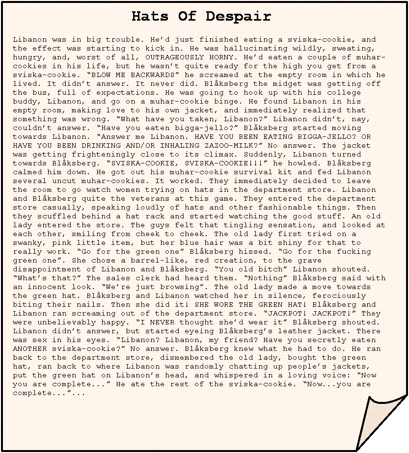 Hats Of Despair Libanon was in big trouble. He’d just finished eating a sviska-cookie, and the effect was starting to kick in. He was hallucinating wildly, sweating, hungry, and, worst of all, OUTRAGEOUSLY HORNY. He’d eaten a couple of muhar-cookies in his life, but he wasn’t quite ready for the high you get from a sviska-cookie. “BLOW ME BACKWARDS” he screamed at the empty room in which he lived. It didn’t answer. It never did. Blåksberg the midget was getting off the bus, full of expectations. He was going to hook up with his college buddy, Libanon, and go on a muhar-cookie binge. He found Libanon in his empty room, making love to his own jacket, and immediately realized that something was wrong. “What have you taken, Libanon?” Libanon didn’t, nay, couldn’t answer. “Have you eaten bigga-jello?” Blåksberg started moving towards Libanon. “Answer me Libanon. HAVE YOU BEEN EATING BIGGA-JELLO? OR HAVE YOU BEEN DRINKING AND/OR INHALING ZAZOO-MILK?” No answer. The jacket was getting frighteningly close to its climax. Suddenly, Libanon turned towards Blåksberg. “SVISKA-COOKIE, SVISKA-COOKIE!!!” he howled. Blåksberg calmed him down. He got out his muhar-cookie survival kit and fed Libanon several uncut muhar-cookies. It worked. They immediately decided to leave the room to go watch women trying on hats in the department store. Libanon and Blåksberg quite the veterans at this game. They entered the department store casually, speaking loudly of hats and other fashionable things. Then they scuffled behind a hat rack and started watching the good stuff. An old lady entered the store. The guys felt that tingling sensation, and looked at each other, smiling from cheek to cheek. The old lady first tried on a swanky, pink little item, but her blue hair was a bit shiny for that to really work. “Go for the green one” Blåksberg hissed. “Go for the fucking green one”. She chose a barrel-like, red creation, to the grave disappointment of Libanon and Blåksberg. “You old bitch” Libanon shouted. “What’s that?” The sales clerk had heard them. “Nothing” Blåksberg said with an innocent look. “We’re just browsing”. The old lady made a move towards the green hat. Blåksberg and Libanon watched her in silence, ferociously biting their nails. Then she did it! SHE WORE THE GREEN HAT! Blåksberg and Libanon ran screaming out of the department store. “JACKPOT! JACKPOT!” They were unbelievably happy. “I NEVER thought she’d wear it” Blåksberg shouted. Libanon didn’t answer, but started eyeing Blåksberg’s leather jacket. There was sex in his eyes. “Libanon? Libanon, my friend? Have you secretly eaten ANOTHER sviska-cookie?” No answer. Blåksberg knew what he had to do. He ran back to the department store, dismembered the old lady, bought the green hat, ran back to where Libanon was randomly chatting up people’s jackets, put the green hat on Libanon’s head, and whispered in a loving voice: “Now you are complete...” He ate the rest of the sviska-cookie. “Now...you are complete...”... |