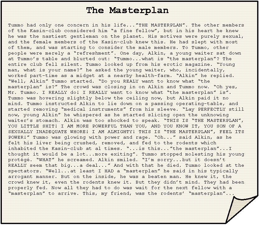 The Masterplan Tummo had only one concern in his life...”THE MASTERPLAN”. The other members of the Kasin-club considered him “a fine fellow”, but in his heart he knew he was the nastiest gentleman on the planet. His motives were purely sexual, and the female members of the Kasin-club knew this. He had slept with most of them, and was starting to consider the male members. To Tummo, other people were merely a “refreshment”. One day, Alkin, a young waiter sat down at Tummo’s table and blurted out: “Tummo...what is “the masterplan”? The entire club fell silent. Tummo looked up from his erotic magazine. “Young man, what is your name?” he asked the young waiter, who, incidentally, worked part-time as a midget at a nearby health-farm. “Alkin” he replied. “Well, Alkin” Tummo started. “Do you REALY want to know what “the masterplan” is?” The crowd was closing in on Alkin and Tummo now. “Oh yes, Mr. Tummo. I REALLY do! I REALLY want to know what “the masterplan” is”. Tummo was hovering slightly below the ceiling now, but Alkin paid it no mind. Tummo instructed Alkin to lie down on a passing operating-table, and started removing “medical instruments” from his sleeve. “Lay PERFECTLY still now, young Alkin” he whispered as he started slicing open the unknowing waiter’s stomach. Alkin was too shocked to speak. “THIS IS “THE MASTERPLAN”, YOU LITTLE SHIT! I AM MORE POWERFUL THAN YOU, AND YOU KNOW IT, YOU SON OF A SEXUALLY INADEQUATE WHORE! I AM ALMIGHTY! THIS IS “THE MASTERPLAN”, FEEL ITS POWER!” Tummo was glowing with power and rage. “Oh...” said Alkin, as he felt his liver being crushed, removed, and fed to the rodents which inhabited the Kasin-club at al times. “...is this...”the masterplan”...I thought it would be a lot...more exiting”. Tummo stopped molesting his young protégé. “WHAT” he screamed. Alkin smiled. “I’m sorry...but it doesn’t REALLY seem that big...a deal...” And with that he died. Tummo looked at the spectators. “Well...at least I HAD a “masterplan” he said in his typically arrogant manner. But on the inside, he was a beaten man. He knew it, the crowd knew it, even the rodents knew it. But they didn’t mind. They had been properly fed. Now all they had to do was wait for the next fellow with a “masterplan” to arrive. This, my friend, was the rodents’ “masterplan”... |