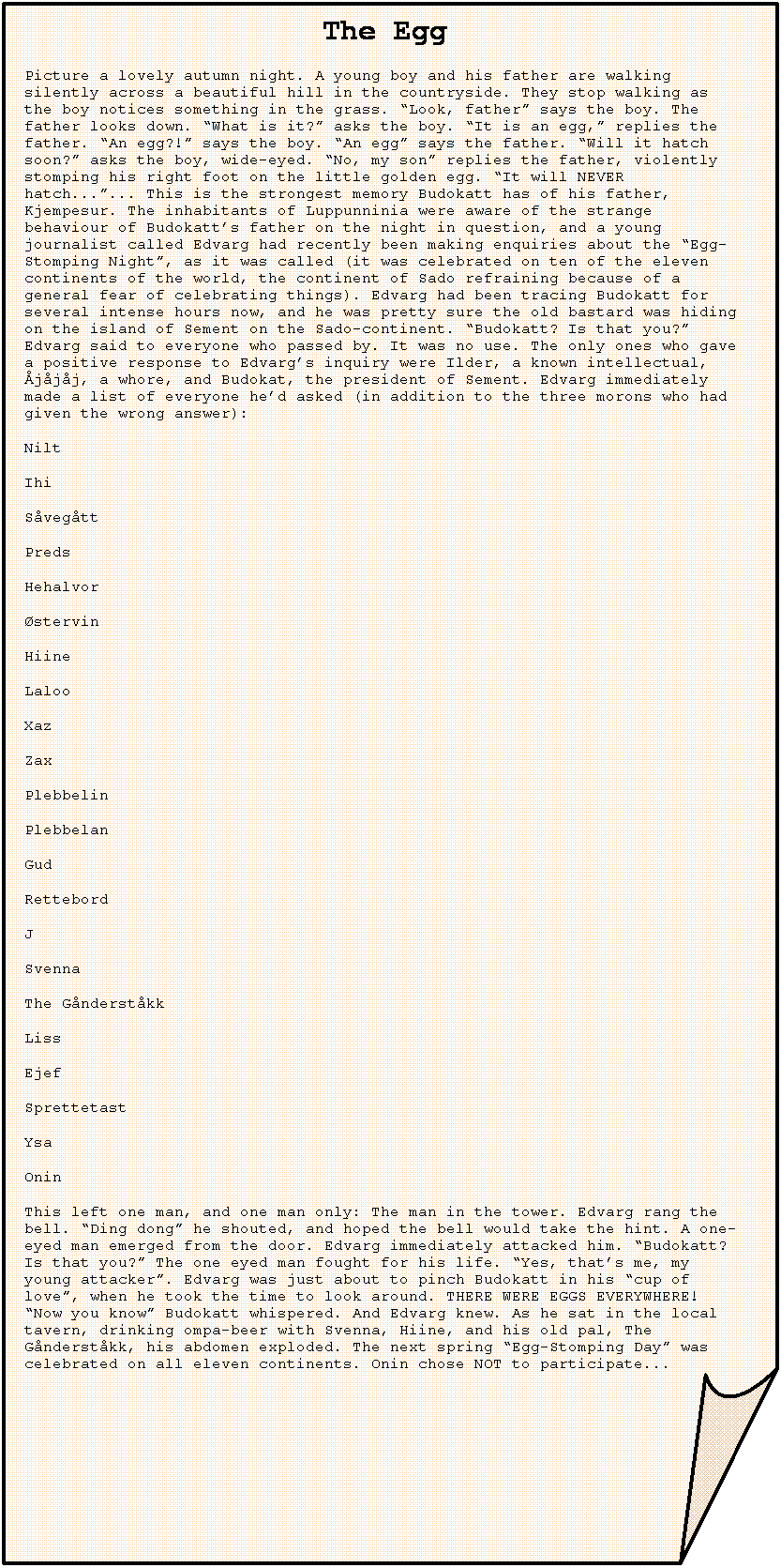 The Egg Picture a lovely autumn night. A young boy and his father are walking silently across a beautiful hill in the countryside. They stop walking as the boy notices something in the grass. “Look, father” says the boy. The father looks down. “What is it?” asks the boy. “It is an egg,” replies the father. “An egg?!” says the boy. “An egg” says the father. “Will it hatch soon?” asks the boy, wide-eyed. “No, my son” replies the father, violently stomping his right foot on the little golden egg. “It will NEVER hatch...”... This is the strongest memory Budokatt has of his father, Kjempesur. The inhabitants of Luppunninia were aware of the strange behaviour of Budokatt’s father on the night in question, and a young journalist called Edvarg had recently been making enquiries about the “Egg-Stomping Night”, as it was called (it was celebrated on ten of the eleven continents of the world, the continent of Sado refraining because of a general fear of celebrating things). Edvarg had been tracing Budokatt for several intense hours now, and he was pretty sure the old bastard was hiding on the island of Sement on the Sado-continent. “Budokatt? Is that you?” Edvarg said to everyone who passed by. It was no use. The only ones who gave a positive response to Edvarg’s inquiry were Ilder, a known intellectual, Åjåjåj, a whore, and Budokat, the president of Sement. Edvarg immediately made a list of everyone he’d asked (in addition to the three morons who had given the wrong answer): Nilt Ihi Såvegått Preds Hehalvor Østervin Hiine Laloo Xaz ZaxPlebbelin Plebbelan Gud Rettebord J Svenna The Gånderståkk Liss Ejef Sprettetast Ysa Onin This left one man, and one man only: The man in the tower. Edvarg rang the bell. “Ding dong” he shouted, and hoped the bell would take the hint. A one-eyed man emerged from the door. Edvarg immediately attacked him. “Budokatt? Is that you?” The one eyed man fought for his life. “Yes, that’s me, my young attacker”. Edvarg was just about to pinch Budokatt in his “cup of love”, when he took the time to look around. THERE WERE EGGS EVERYWHERE! “Now you know” Budokatt whispered. And Edvarg knew. As he sat in the local tavern, drinking ompa-beer with Svenna, Hiine, and his old pal, The Gånderståkk, his abdomen exploded. The next spring “Egg-Stomping Day” was celebrated on all eleven continents. Onin chose NOT to participate... |