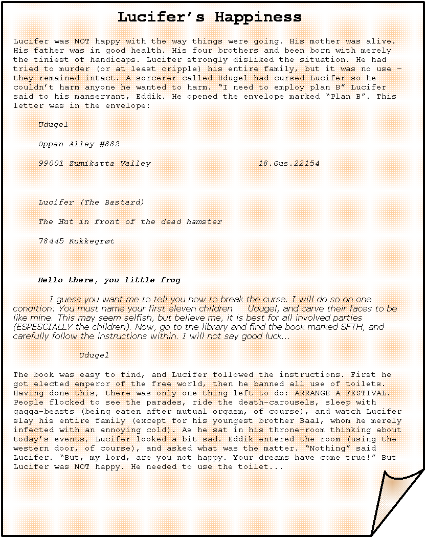 Lucifer’s Happiness Lucifer was NOT happy with the way things were going. His mother was alive. His father was in good health. His four brothers and been born with merely the tiniest of handicaps. Lucifer strongly disliked the situation. He had tried to murder (or at least cripple) his entire family, but it was no use – they remained intact. A sorcerer called Udugel had cursed Lucifer so he couldn’t harm anyone he wanted to harm. “I need to employ plan B” Lucifer said to his manservant, Eddik. He opened the envelope marked “Plan B”. This letter was in the envelope: Udugel Oppan Alley #882 99001 Zumikatta Valley 18.Gus.22154