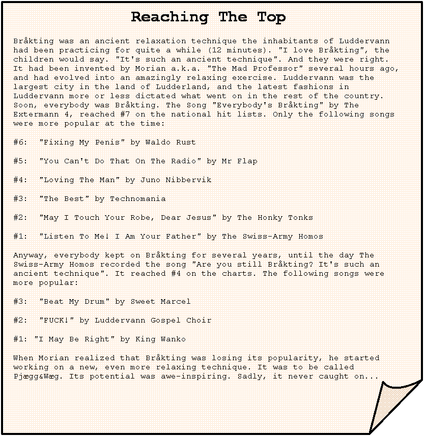 Reaching The Top Bråkting was an ancient relaxation technique the inhabitants of Luddervann had been practicing for quite a while (12 minutes). "I love Bråkting", the children would say. "It's such an ancient technique". And they were right. It had been invented by Morian a.k.a. "The Mad Professor" several hours ago, and had evolved into an amazingly relaxing exercise. Luddervann was the largest city in the land of Ludderland, and the latest fashions in Luddervann more or less dictated what went on in the rest of the country. Soon, everybody was Bråkting. The Song "Everybody's Bråkting" by The Extermann 4, reached #7 on the national hit lists. Only the following songs were more popular at the time: #6: "Fixing My Penis" by Waldo Rust #5: "You Can't Do That On The Radio" by Mr Flap #4: "Loving The Man" by Juno Nibbervik #3: "The Best" by Technomania #2: "May I Touch Your Robe, Dear Jesus" by The Honky Tonks #1: "Listen To Me! I Am Your Father" by The Swiss-Army Homos Anyway, everybody kept on Bråkting for several years, until the day The Swiss-Army Homos recorded the song "Are you still Bråkting? It's such an ancient technique". It reached #4 on the charts. The following songs were more popular: #3: "Beat My Drum" by Sweet Marcel #2: "FUCK!" by Luddervann Gospel Choir #1: "I May Be Right" by King Wanko When Morian realized that Bråkting was losing its popularity, he started working on a new, even more relaxing technique. It was to be called Pjægg&Wæg. Its potential was awe-inspiring. Sadly, it never caught on... |