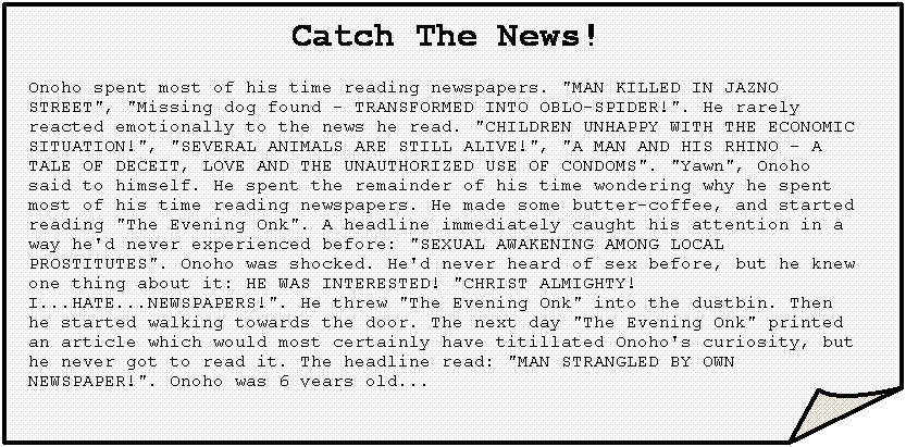 Catch The News! Onoho spent most of his time reading newspapers. "MAN KILLED IN JAZNO STREET", "Missing dog found - TRANSFORMED INTO OBLO-SPIDER!". He rarely reacted emotionally to the news he read. "CHILDREN UNHAPPY WITH THE ECONOMIC SITUATION!", "SEVERAL ANIMALS ARE STILL ALIVE!", "A MAN AND HIS RHINO - A TALE OF DECEIT, LOVE AND THE UNAUTHORIZED USE OF CONDOMS". "Yawn", Onoho said to himself. He spent the remainder of his time wondering why he spent most of his time reading newspapers. He made some butter-coffee, and started reading "The Evening Onk". A headline immediately caught his attention in a way he'd never experienced before: "SEXUAL AWAKENING AMONG LOCAL PROSTITUTES". Onoho was shocked. He'd never heard of sex before, but he knew one thing about it: HE WAS INTERESTED! "CHRIST ALMIGHTY! I...HATE...NEWSPAPERS!". He threw "The Evening Onk" into the dustbin. Then he started walking towards the door. The next day "The Evening Onk" printed an article which would most certainly have titillated Onoho's curiosity, but he never got to read it. The headline read: "MAN STRANGLED BY OWN NEWSPAPER!". Onoho was 6 years old...