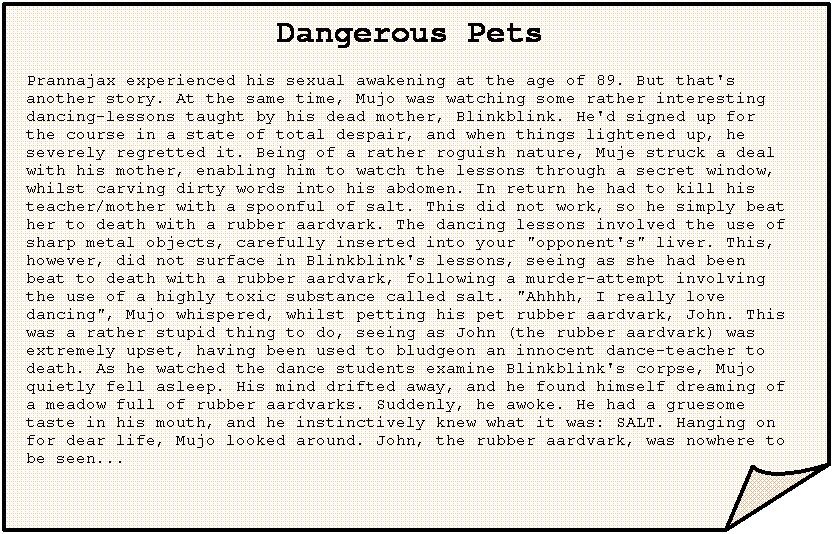 Dangerous Pets Prannajax experienced his sexual awakening at the age of 89. But that's another story. At the same time, Mujo was watching some rather interesting dancing-lessons taught by his dead mother, Blinkblink. He'd signed up for the course in a state of total despair, and when things lightened up, he severely regretted it. Being of a rather roguish nature, Muje struck a deal with his mother, enabling him to watch the lessons through a secret window, whilst carving dirty words into his abdomen. In return he had to kill his teacher/mother with a spoonful of salt. This did not work, so he simply beat her to death with a rubber aardvark. The dancing lessons involved the use of sharp metal objects, carefully inserted into your "opponent's" liver. This, however, did not surface in Blinkblink's lessons, seeing as she had been beat to death with a rubber aardvark, following a murder-attempt involving the use of a highly toxic substance called salt. "Ahhhh, I really love dancing", Mujo whispered, whilst petting his pet rubber aardvark, John. This was a rather stupid thing to do, seeing as John (the rubber aardvark) was extremely upset, having been used to bludgeon an innocent dance-teacher to death. As he watched the dance students examine Blinkblink's corpse, Mujo quietly fell asleep. His mind drifted away, and he found himself dreaming of a meadow full of rubber aardvarks. Suddenly, he awoke. He had a gruesome taste in his mouth, and he instinctively knew what it was: SALT. Hanging on for dear life, Mujo looked around. John, the rubber aardvark, was nowhere to be seen... |