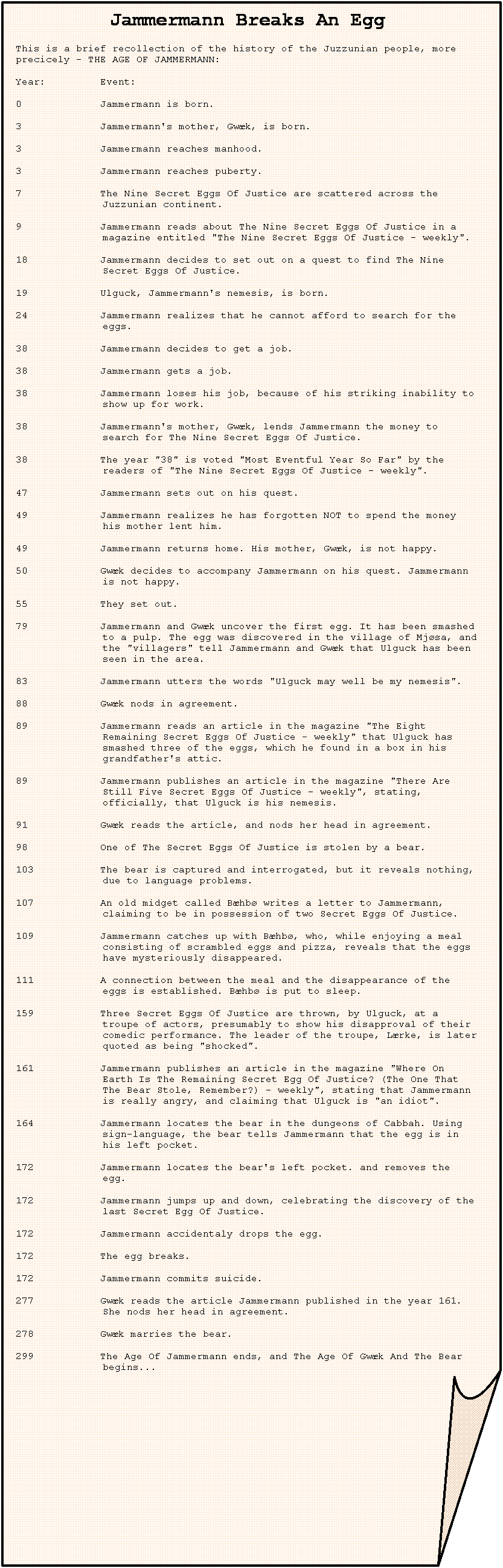 Jammermann Breaks An Egg This is a brief recollection of the history of the Juzzunian people, more precicely - THE AGE OF JAMMERMANN: Year: Event: 0 Jammermann is born. 3 Jammermann's mother, Gwæk, is born. 3 Jammermann reaches manhood. 3 Jammermann reaches puberty. 7 The Nine Secret Eggs Of Justice are scattered across the Juzzunian continent. 9 Jammermann reads about The Nine Secret Eggs Of Justice in a magazine entitled "The Nine Secret Eggs Of Justice - weekly". 18 Jammermann decides to set out on a quest to find The Nine Secret Eggs Of Justice. 19 Ulguck, Jammermann's nemesis, is born. 24 Jammermann realizes that he cannot afford to search for the eggs. 38 Jammermann decides to get a job. 38 Jammermann gets a job. 38 Jammermann loses his job, because of his striking inability to show up for work. 38 Jammermann's mother, Gwæk, lends Jammermann the money to search for The Nine Secret Eggs Of Justice. 38 The year "38" is voted "Most Eventful Year So Far" by the readers of "The Nine Secret Eggs Of Justice - weekly". 47 Jammermann sets out on his quest. 49 Jammermann realizes he has forgotten NOT to spend the money his mother lent him. 49 Jammermann returns home. His mother, Gwæk, is not happy. 50 Gwæk decides to accompany Jammermann on his quest. Jammermann is not happy. 55 They set out. 79 Jammermann and Gwæk uncover the first egg. It has been smashed to a pulp. The egg was discovered in the village of Mjøsa, and the "villagers" tell Jammermann and Gwæk that Ulguck has been seen in the area. 83 Jammermann utters the words "Ulguck may well be my nemesis". 88 Gwæk nods in agreement. 89 Jammermann reads an article in the magazine "The Eight Remaining Secret Eggs Of Justice - weekly" that Ulguck has smashed three of the eggs, which he found in a box in his grandfather's attic. 89 Jammermann publishes an article in the magazine "There Are Still Five Secret Eggs Of Justice - weekly", stating, officially, that Ulguck is his nemesis. 91 Gwæk reads the article, and nods her head in agreement. 98 One of The Secret Eggs Of Justice is stolen by a bear. 103 The bear is captured and interrogated, but it reveals nothing, due to language problems. 107 An old midget called Bæhbø writes a letter to Jammermann, claiming to be in possession of two Secret Eggs Of Justice. 109 Jammermann catches up with Bæhbø, who, while enjoying a meal consisting of scrambled eggs and pizza, reveals that the eggs have mysteriously disappeared. 111 A connection between the meal and the disappearance of the eggs is established. Bæhbø is put to sleep. 159 Three Secret Eggs Of Justice are thrown, by Ulguck, at a troupe of actors, presumably to show his disapproval of their comedic performance. The leader of the troupe, Lærke, is later quoted as being "shocked". 161 Jammermann publishes an article in the magazine "Where On Earth Is The Remaining Secret Egg Of Justice? (The One That The Bear Stole, Remember?) - weekly", stating that Jammermann is really angry, and claiming that Ulguck is "an idiot". 164 Jammermann locates the bear in the dungeons of Cabbah. Using sign-language, the bear tells Jammermann that the egg is in his left pocket. 172 Jammermann locates the bear's left pocket. and removes the egg. 172 Jammermann jumps up and down, celebrating the discovery of the last Secret Egg Of Justice. 172 Jammermann accidentaly drops the egg. 172 The egg breaks. 172 Jammermann commits suicide. 277 Gwæk reads the article Jammermann published in the year 161. She nods her head in agreement. 278 Gwæk marries the bear. 299 The Age Of Jammermann ends, and The Age Of Gwæk And The Bear begins... |